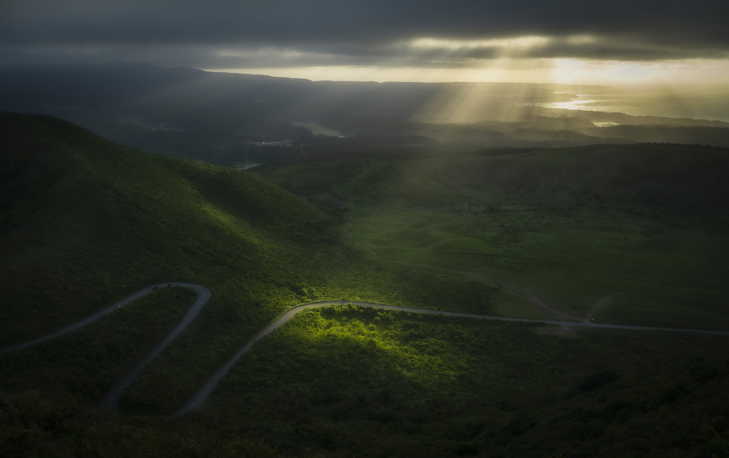 男鹿市寒風山で撮影した1枚。風が強くめまぐるしく目の前の景色が変わっていく中、雲の隙間から光芒が差し、その光がアスファルトにあたる一瞬を捉えました。