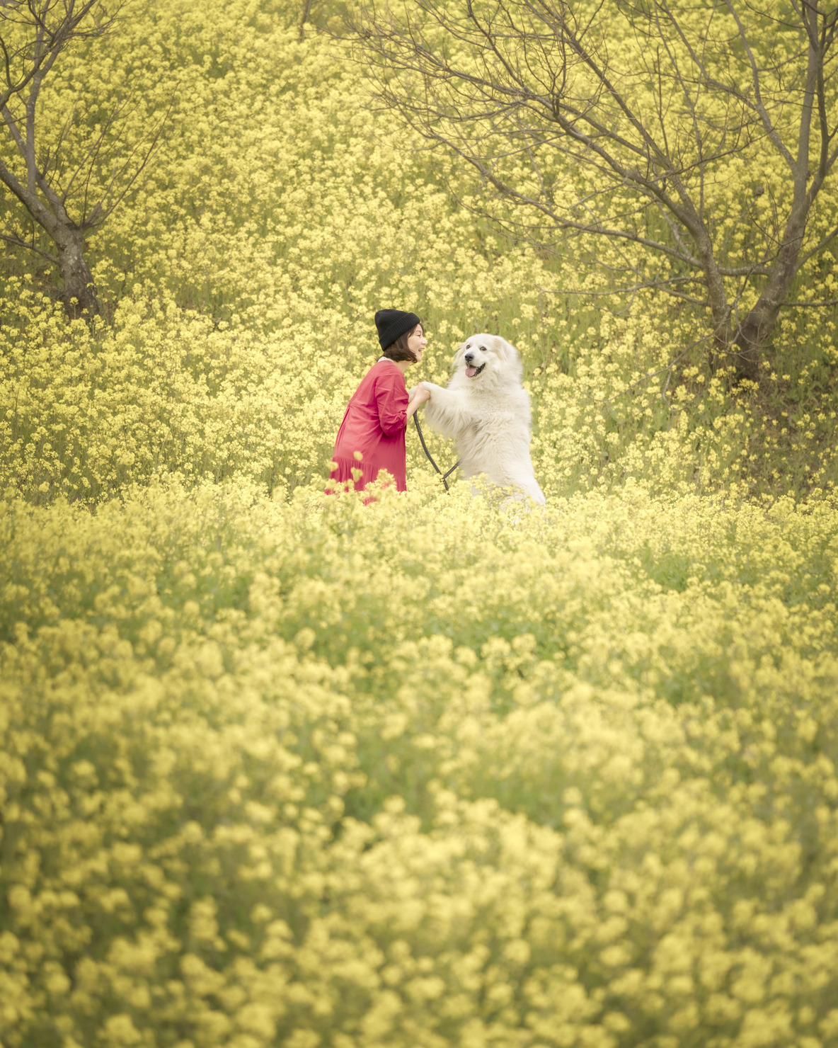 春になると、約2ヘクタールある丘が一面黄色に染まる景色は圧巻でした。訪れた瞬間に、この黄色い菜の花に包まれた写真を撮りたいと思い散策しました。愛犬と立っている場所は通路ですが、撮影するポイントを工夫することで、このような一枚を撮影することができました。こちらを撮影した日は愛犬の誕生日でしたので、このような賞をいただけて大変光栄に思っています。